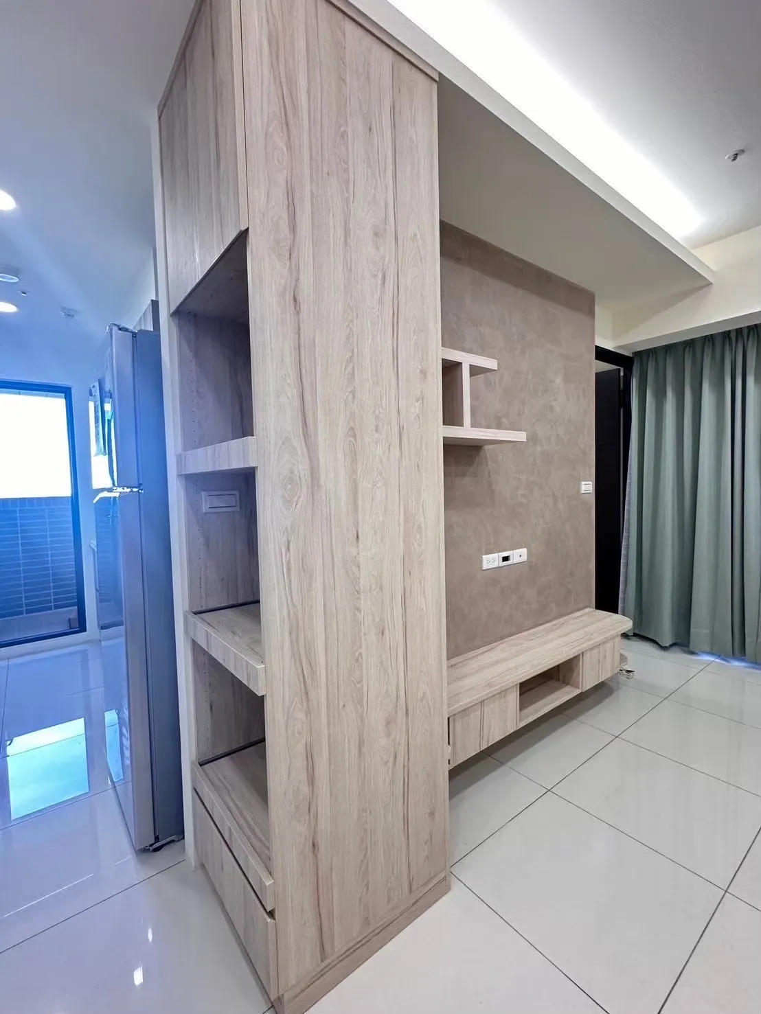 以整面系統櫃、懸浮櫃設計取代單一置物櫃,讓空間更俐落。